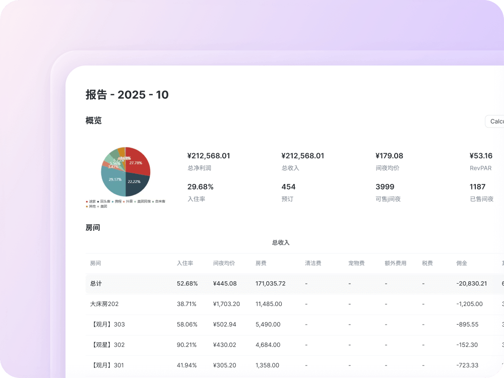 实时获取整体房源的关键指标,包括每日入住率、平均房价及单房收益。所有数据按入住日期自动归类,支持按房源、按渠道筛选,并可进行日、周、月度区间对比分析。