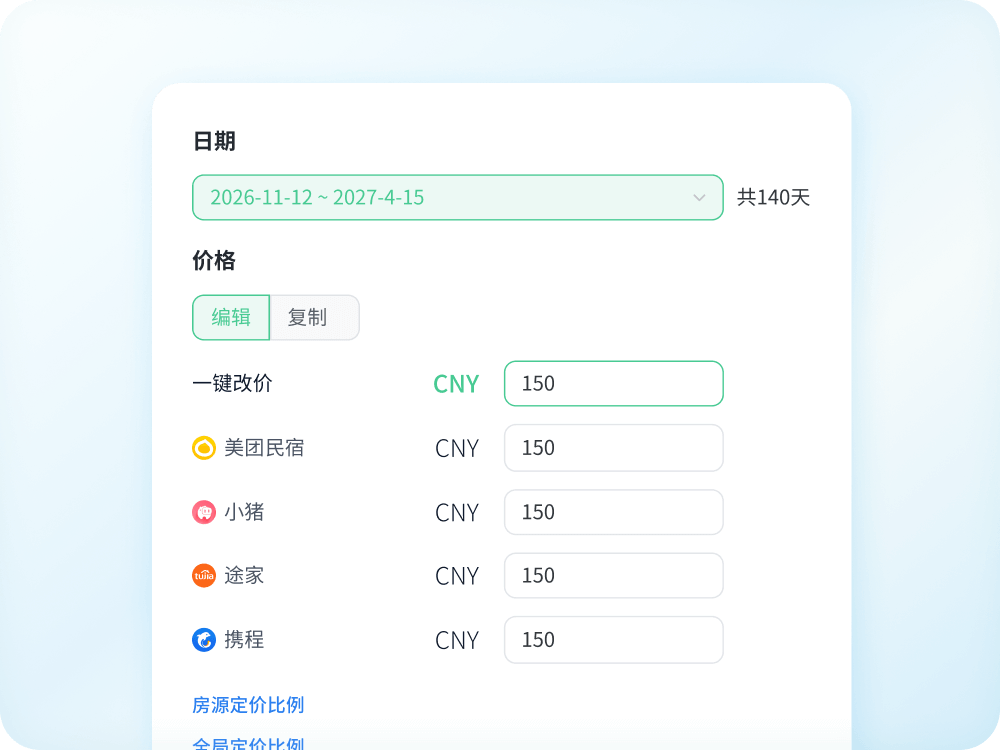 定价比例管理: 为特定渠道或特定房源设置定价比例,一键完成差异化定价。