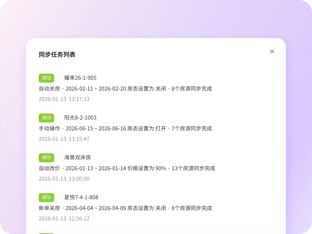 即刻查看美团、途家、携程、木鸟、小猪、抖音等所有渠道房源的每日房价,并精准保持所有信息同步更新,确保万无一失。