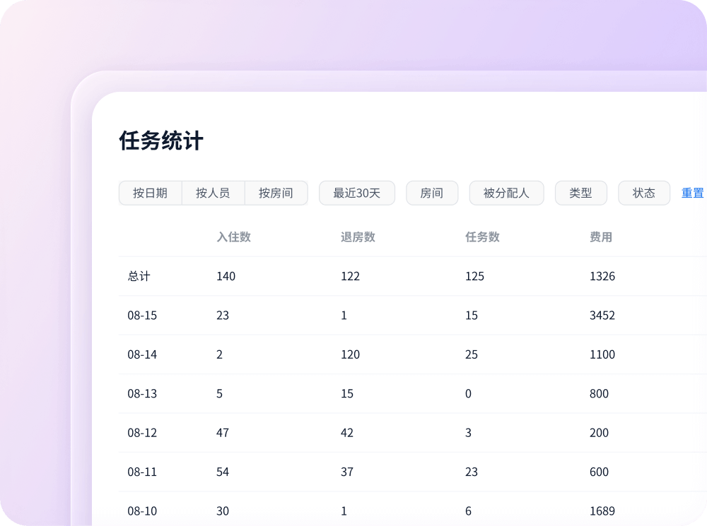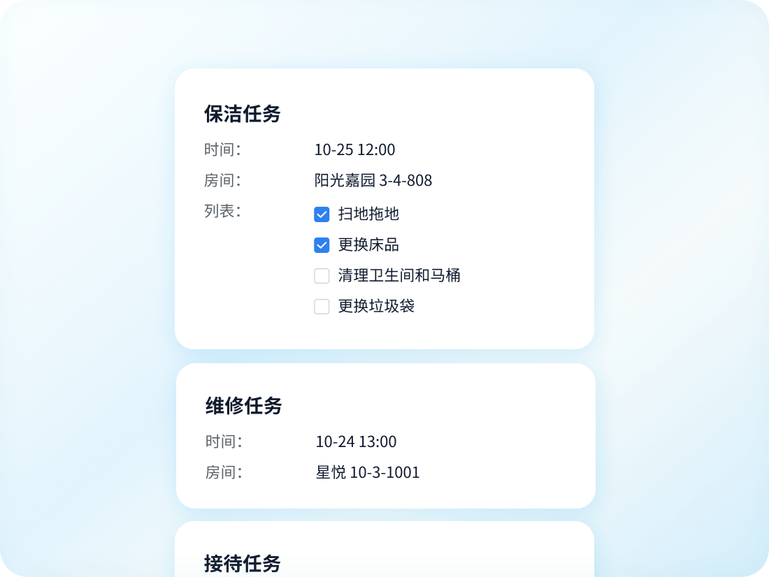 基于客人的入住/退房,系统将自动生成带详细清单的保洁任务。确保流程标准化,无一遗漏。系统将自动分配任务给指定保洁员,并通过微信通知。
